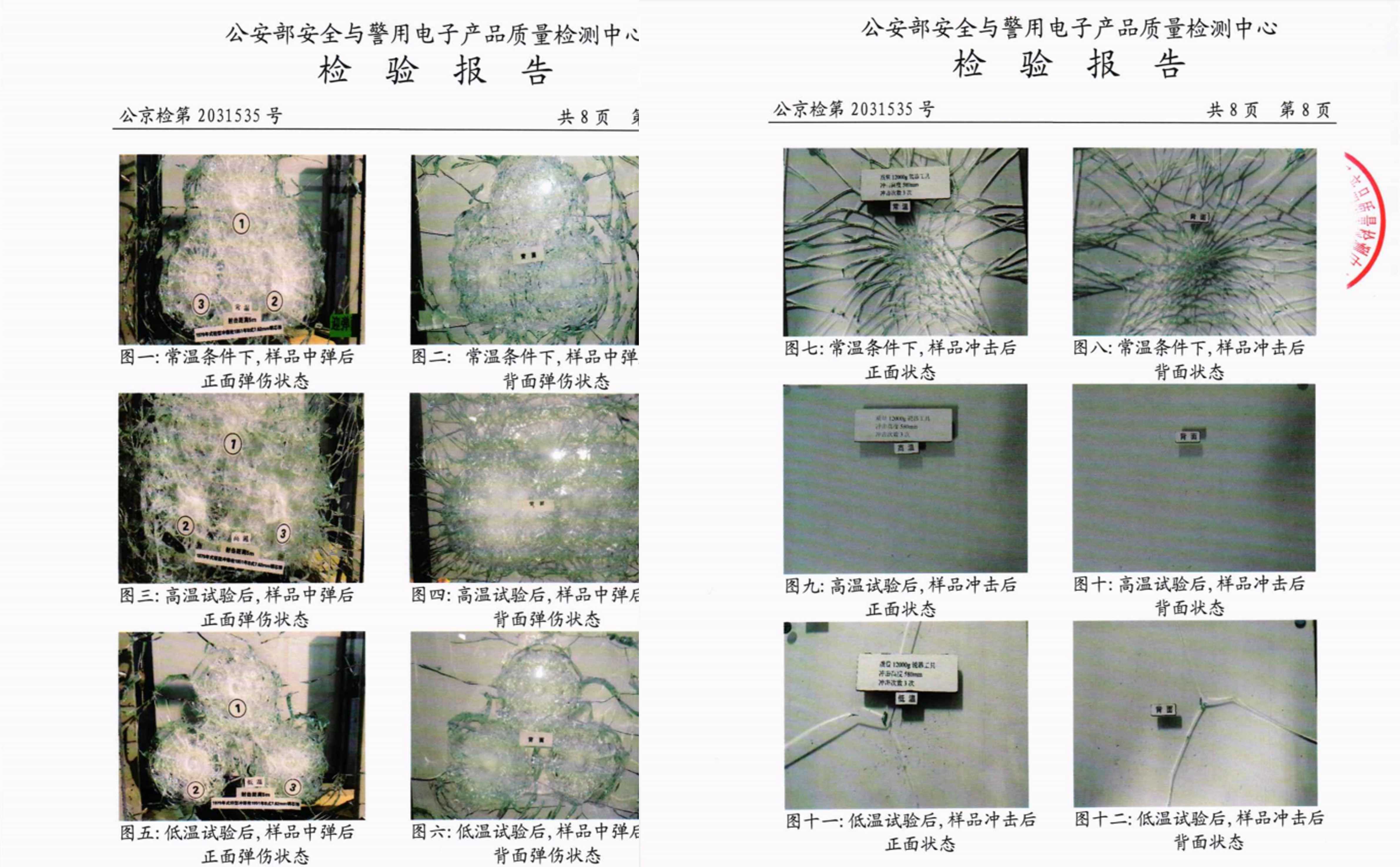 如下圖片防彈防砸的檢驗(yàn)報(bào)告分別在常溫高溫低溫中進(jìn)行實(shí)彈射擊,和銳器沖擊測(cè)試: